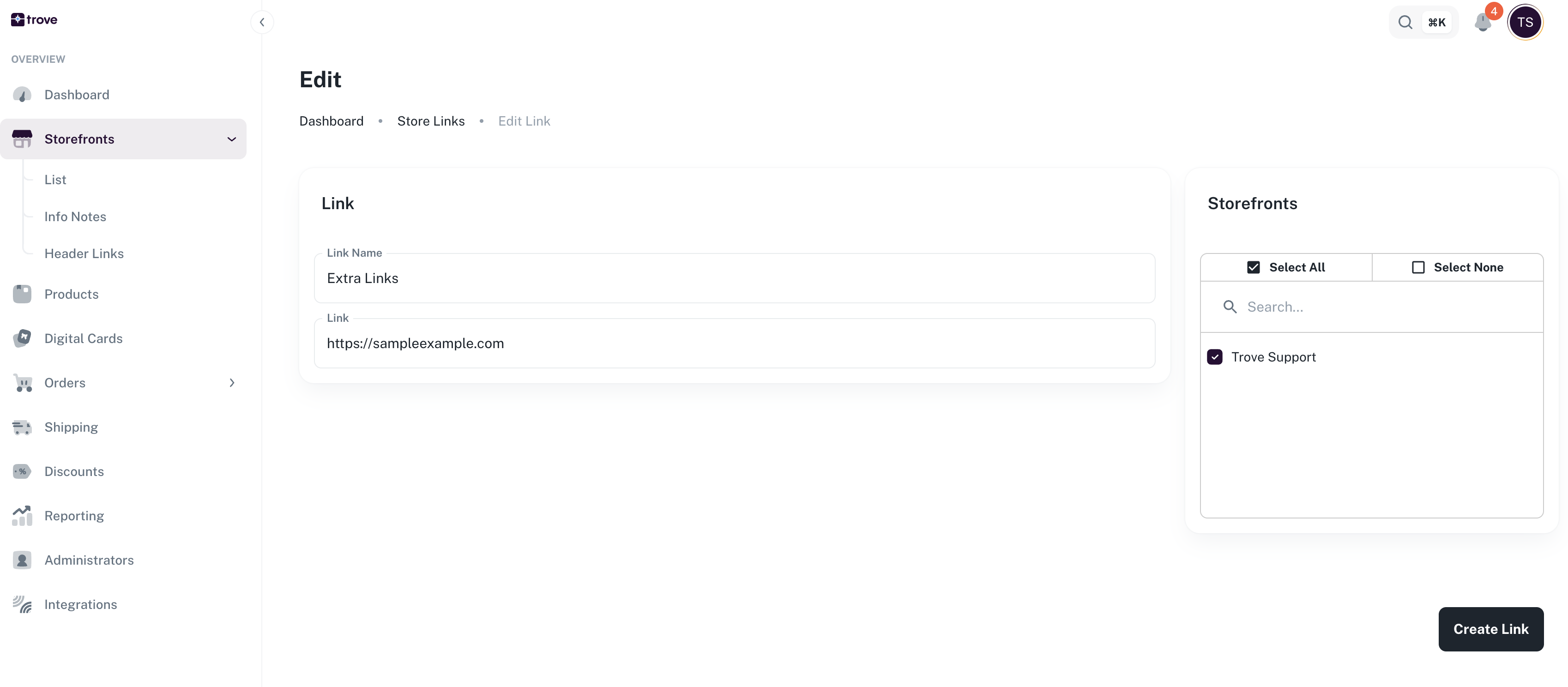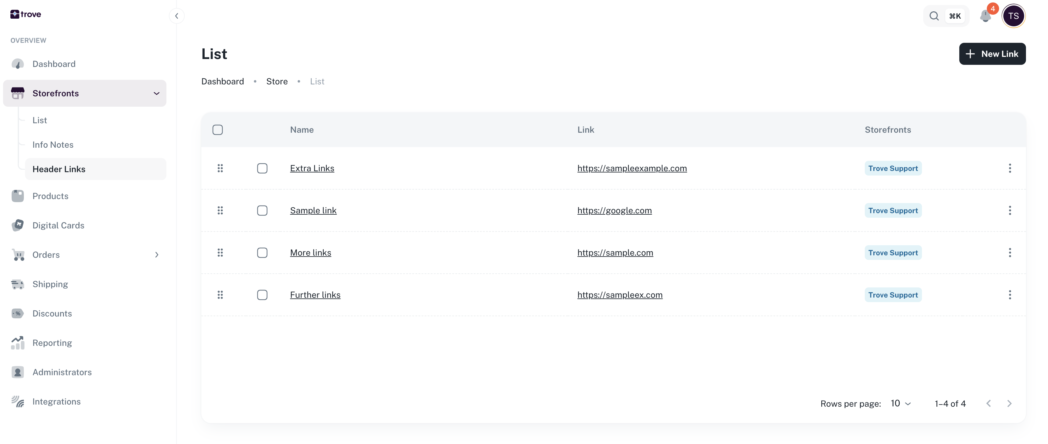 To update your header links you will need to go to your menu item "Storefronts" then "Header Links" Here you will see the list of your links or no links To add a new link you will need to click on the "New Link" button in the top right Here you will ...