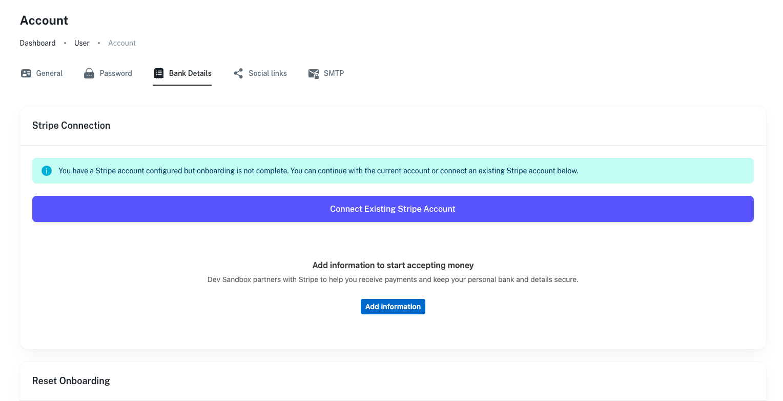 To reset your Stripe connection, head to your profile icon in the top right of the page In the dropdown menu select "Vendor Profile" On this page you will need to click on the "Bank Details" tab From here you will see the following: You just need to ...